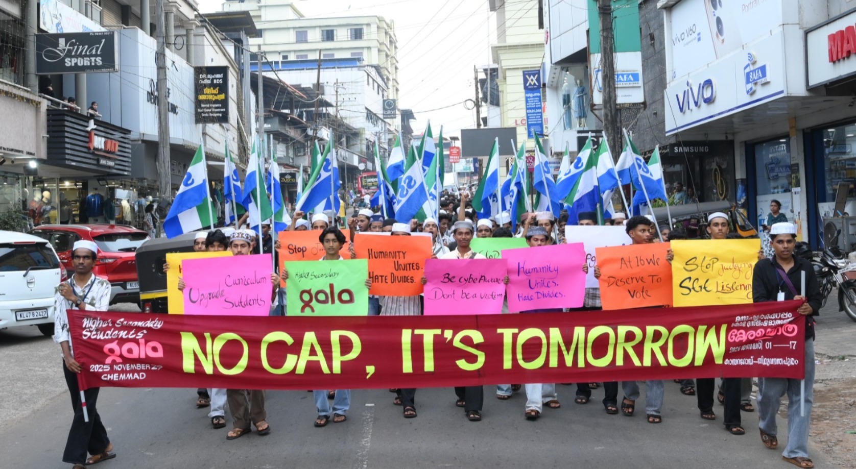 തിരൂരങ്ങാടി : കേരള മുസ്ലിം ജമാഅത്തിൻ്റെ നേതൃത്വത്തിൽ ‘മനുഷ്യരോടൊപ്പം’ എന്ന പ്രമേയത്തിൽ ജനുവരി 1 മുതൽ 17 വരെ നടക്കുന്ന കേരള യാത്രയുടെ പ്രചാരണാർത്ഥം ‘നോ ക്യാപ് ഇറ്റ്സ് ടുമാറോ’ എന്ന പ്രേമേയത്തിൽ എസ് എസ് എഫ് മലപ്പുറം വെസ്റ്റ് ജില്ലാ കമ്മിറ്റിക്കു കീഴിൽ ചെമ്മാട് താജ് കൺവെൻഷൻ സെൻ്ററിൽ നടന്ന ഹയർ സെക്കണ്ടറി സ്റ്റുഡൻ്റസ് ഗാല പ്രൗഢമായി. കേരള മുസ്ലിം ജമാഅത്ത് സംസ്ഥാന ജനറൽ സെക്രട്ടറി സയ്യിദ് ഇബ്രാഹിം ഖലീൽ ബുഖാരി ഗാല ഉദ്ഘടനം ചെയ്തു. 3 വേദികളിലായി വ്യത്യസ്ത സെഷനുകളിലായാണ് ഗാല നടന്നത്. എസ് എസ് എഫ് സംസ്ഥാന പ്രസിഡൻ്റ് സയ്യിദ് മുനീറുൽ അഹ്ദൽ കാസർഗോഡ്, സംസ്ഥാന ജനറൽ സെക്രട്ടറി ഡോ ടി അബൂബക്കർ, മുഹമ്മദ് അനസ് അമാനി, എസ് വൈ എസ് മലപ്പുറം വെസ്റ്റ് ജില്ല പ്രസിഡൻ്റ് അബ്ദുൽ മജീദ് അഹ്സനി, ടി കെ മുഹമ്മദ് റമീസ്, ആഷിഖ് അഹ്സനി, പി ടി മുഹമ്മദ് സഖാഫി, യഅ്ഖൂബ് പൈലിപ്പുറം, യൂസുഫ് സഖാഫി കുറ്റാളൂർ, നുറുദ്ധീൻ മുസ്തഫ, ജാഫർ ശാമിൽ ഇർഫാനി, പി ടി മുഹമ്മദ് അഫ്ളൽ, മുഹമ്മദ് റഫീഖ് അഹ്സനി, മൻസൂർ, അഡ്വ. അബ്ദുൽ മജീദ്, ദാവൂദ് സഖാഫി തുടങ്ങിയവർ വ്യത്യസ്ത സെക്ഷനുകൾക്ക് നേതൃത്വം നൽകി. ജില്ലയിലെ എൺപത് ഹയർ സെക്കണ്ടറി സ്കൂളുകളിൽ നിന്നുമായി 2000ൽ പരം വിദ്യാർഥികൾ പ്രതിനിധികളായി.