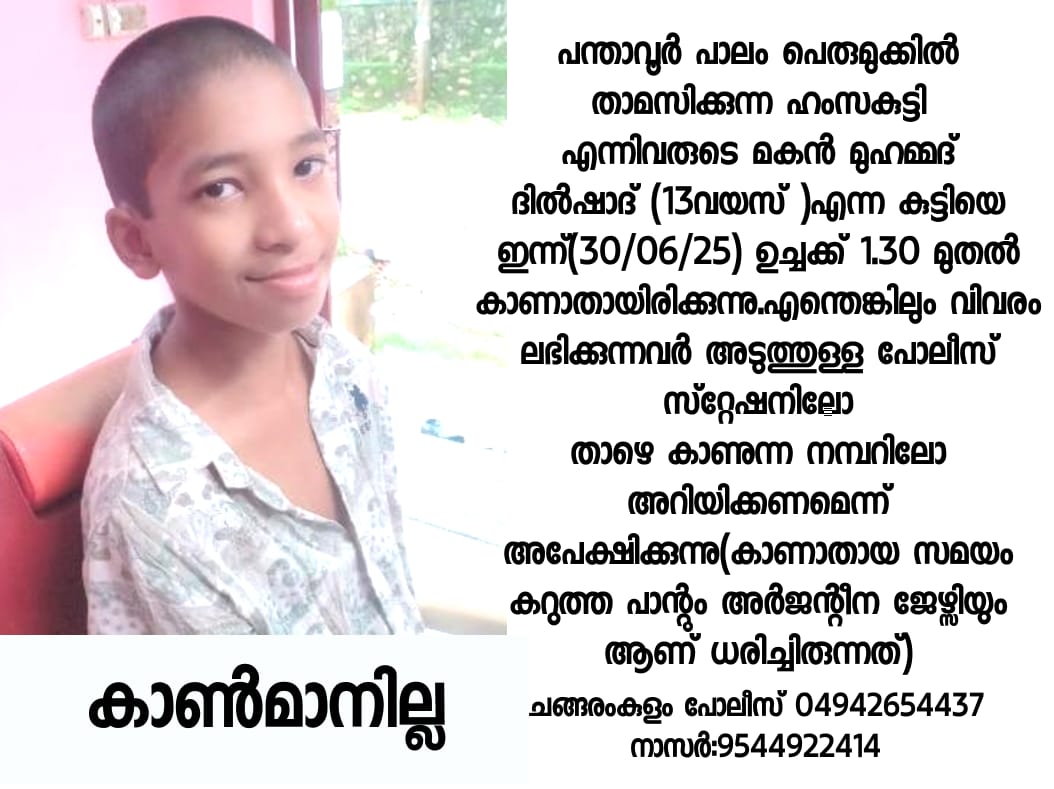 ചങ്ങരംകുളം:പന്താവൂർ പാലം പെരുമുക്കിൽ താമസിക്കുന്ന ഹംസകുട്ടി എന്നിവരുടെ മകൻ മുഹമ്മദ് ദിൽഷാദ് (13വയസ് )എന്ന കുട്ടിയെ ഇന്ന്(30/06/25) ഉച്ചക്ക് 1.30 മുതൽ കാണാതായിരിക്കുന്നു.എന്തെങ്കിലും വിവരം ലഭിക്കുന്നവര് അടുത്തുള്ള പോലീസ് സ്റ്റേഷനിലോ