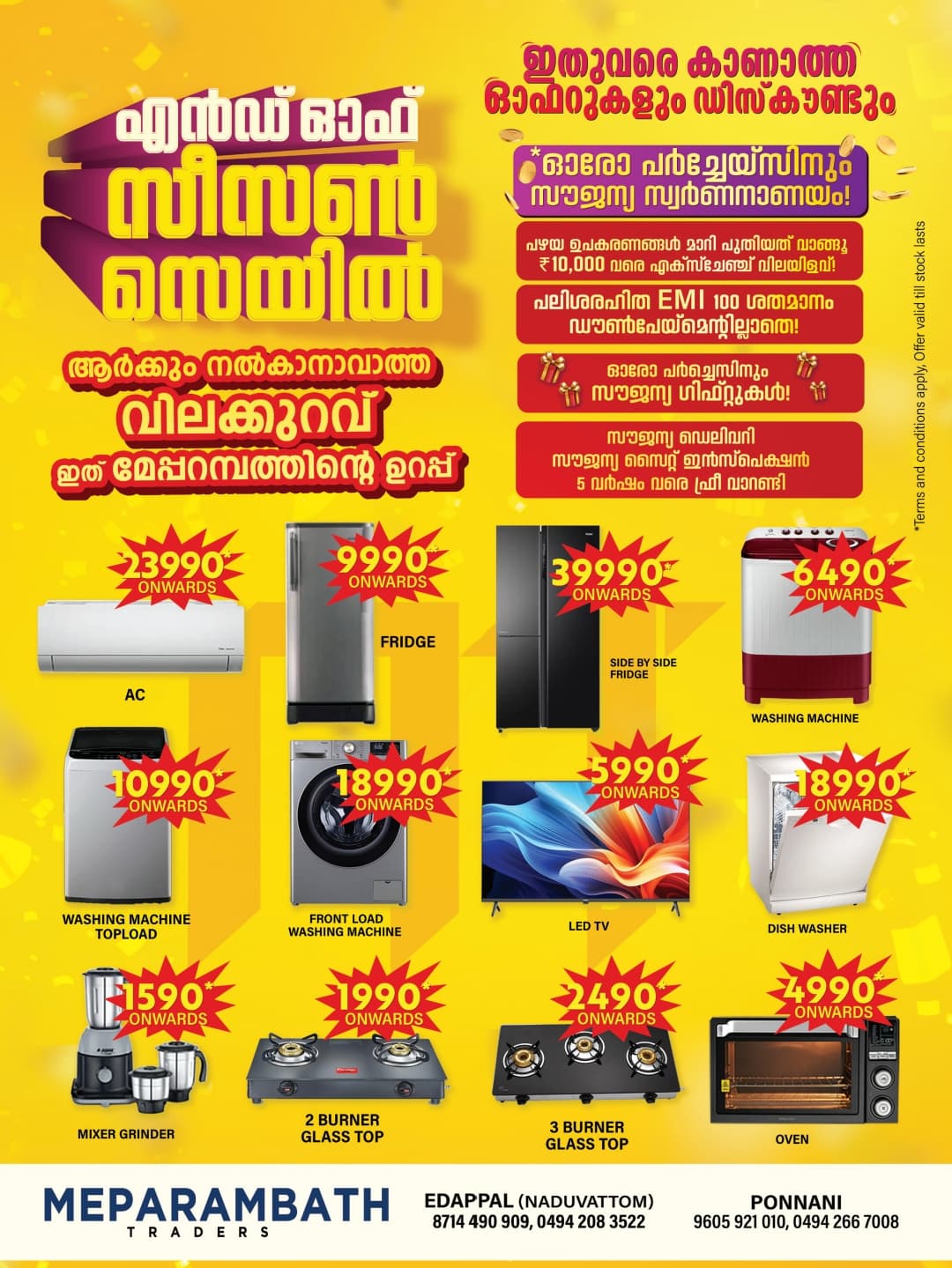 <p><em>â5 വർഷഠവരൠഫàµà´°àµ വാറണàµà´à´¿</em><br>▪ï¸AC 23990 ONWARDS<br>▪ï¸FRIDGE 9990 ONWARDS<br>▪ï¸SIDE BY SIDE FRIDGE 39990 ONWARDS<br>▪ï¸WASHING MACHINE 6490 ONWARDS<br>▪ï¸WASHING MACHINE TOPLOAD 10990 ONWARDS<br>▪ï¸DISH WASHER 18990 ONWARDS<br>▪ï¸LED TV 5990 ONWARDS<br>▪ï¸FRONT LOAD WASHING MACHINE 18990 ONWARDS<br>▪ï¸MIXER GRINDER 1590 ONWARDS<br>▪ï¸2 BURNER GLASS TOP 1990 ONWARDS<br>▪ï¸3 BURNER GLASS TOP 2490 ONWARDS<br>▪ï¸OVEN 4990 ONWARDS<br><em>MEPARAMBATH TRADERS</em><br>EDAPPAL (NADUVATTOM)<br>ð² 8714 490 909,ð 0494 208 3522</p>