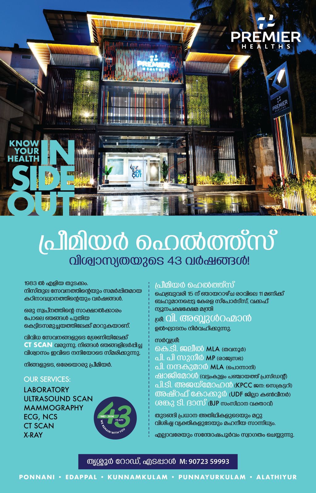 <p>à´ªàµà´°àµà´®à´¿à´¯àµ¼ à´¹àµàµ½à´¤àµà´¤àµà´¸àµ<br>à´«àµà´¬àµà´°àµà´µà´°à´¿ 15 നൠà´à´¾à´¯à´±à´¾à´´àµà´ രാവിലൠ11 മണിà´àµà´àµ<br>ബഹàµà´®à´¾à´¨à´ªàµà´ªàµà´àµà´ à´àµà´°à´³ à´¸àµà´ªàµàµ¼à´àµà´¸àµ, à´µà´àµà´à´«àµ<br>à´¨àµà´¯àµà´¨à´ªà´àµà´·à´àµà´·àµà´® മനàµà´¤àµà´°à´¿<br>à´¶àµà´°àµ വി. à´ à´¬àµà´¦àµàµ¾à´±à´¹àµà´®à´¾àµ»<br>à´àµ½à´à´¾à´à´¨à´ നിർവഹിà´àµà´àµà´¨àµà´¨àµ.<br>സർവàµà´µà´¶àµà´°àµ<br>à´àµ.à´à´¿. à´à´²àµàµ½ MLA (തവനàµàµ¼)<br>പി. പി à´¸àµà´¨àµàµ¼ MP (à´°à´¾à´àµà´¯à´¸à´)<br>പി. നനàµà´¦à´àµà´®à´¾àµ¼ MLA (à´ªàµà´¨àµà´¨à´¾à´¨à´¿)<br>à´·à´¾à´à´¿à´®àµàµ¾ à´µà´àµà´à´à´àµà´³à´ à´ªà´àµà´à´¾à´¯à´¤àµà´¤àµ à´ªàµà´°à´¸à´¿à´¡à´¨àµà´±àµ<br>പി.à´à´¿. à´ à´à´¯àµà´®àµà´¹àµ» (KPCC à´à´¨: à´¸àµà´àµà´°à´àµà´à´±à´¿)<br>à´ à´·àµà´±à´«àµ à´àµà´àµà´àµàµ¼ (UDF à´à´¿à´²àµà´²à´¾ à´àµºà´µàµà´¨àµ¼)<br>à´¶à´àµà´àµ à´à´¿. ദാസൠ(BJP à´¸à´à´¸àµà´¥à´¾à´¨ à´µà´àµà´¤à´¾à´µàµ)<br>à´¤àµà´à´àµà´à´¿ à´ªàµà´°à´§à´¾à´¨ ഠതിഥിà´à´³àµà´àµà´¯àµà´ മറàµà´±àµ<br>വിശിഷàµà´ à´µàµà´¯à´àµà´¤à´¿à´à´³àµà´àµà´¯àµà´ മഹനàµà´¯ സാനàµà´¨à´¿à´§àµà´¯à´.<br>à´à´²àµà´²à´¾à´µà´°àµà´¯àµà´ സനàµà´¤àµà´·à´ªàµàµ¼à´µà´ à´¸àµà´µà´¾à´à´¤à´ à´àµà´¯àµà´¯àµà´¨àµà´¨àµ.<br>à´¤àµà´¶àµà´¶àµàµ¼ à´±àµà´¡àµ, à´à´à´ªàµà´ªà´¾àµ¾ M: 90723 59993<br>PONNANI EDAPPAL KUNNAMKULAM PUNNAYURKULAM ALATHIYUR</p>