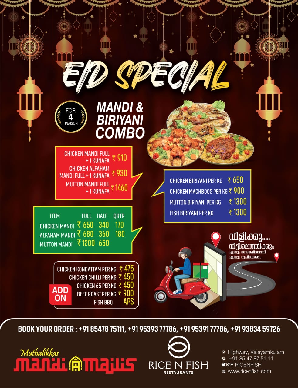 <p><em>Special Eid Sweets</em><br><em>KUNAFA</em> (Mozzarella Cheese, Double Cream and Chocolate)<br><em>വലിയ à´ªàµà´°àµà´¨àµà´¨à´¾àµ¾ à´¸àµà´ªàµà´·àµà´¯àµ½</em><br><em>Muthalikkas One Full Mutton Mandi ( 7Kg to 13Kg)</em></p>