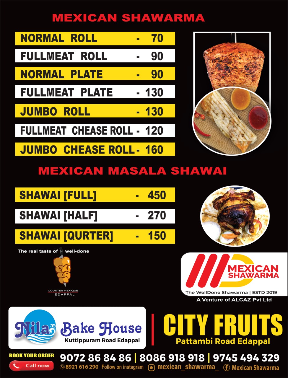 <p><em>MEXICAN SHAWARMA</em><br>The WellDone Shawarma | ESTD 2019 A Venture of ALCAZ Pvt Ltd<br>CITY FRUITS Pattambi Road Edappal</p>