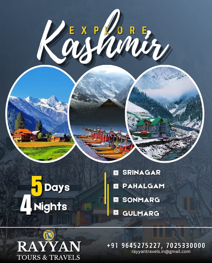 <p><strong><em>RAYYAN</em><br><em>TOURS &; TRAVELS</em></strong><em><br>+91 9645275227</em><br><em>+91 7025330000</em><br>â¨Facebook<br>https://www.facebook.com/RayyanToursandTravels/<br>â¨Instagram<br>https://www.instagram.com/rayyan_tours_travels</p>