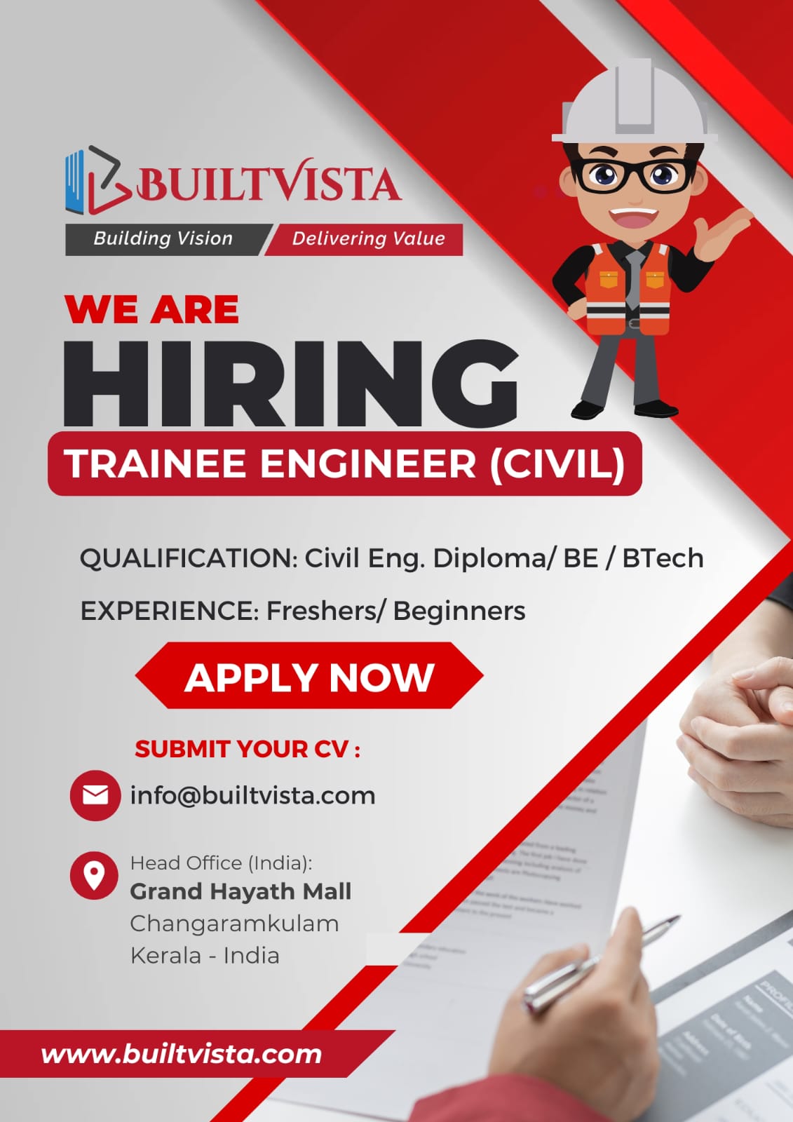 <p>QUALIFICATION: Civil Eng. Diploma/ BE / BTech<br>EXPERIENCE: Freshers/ Beginners</p>