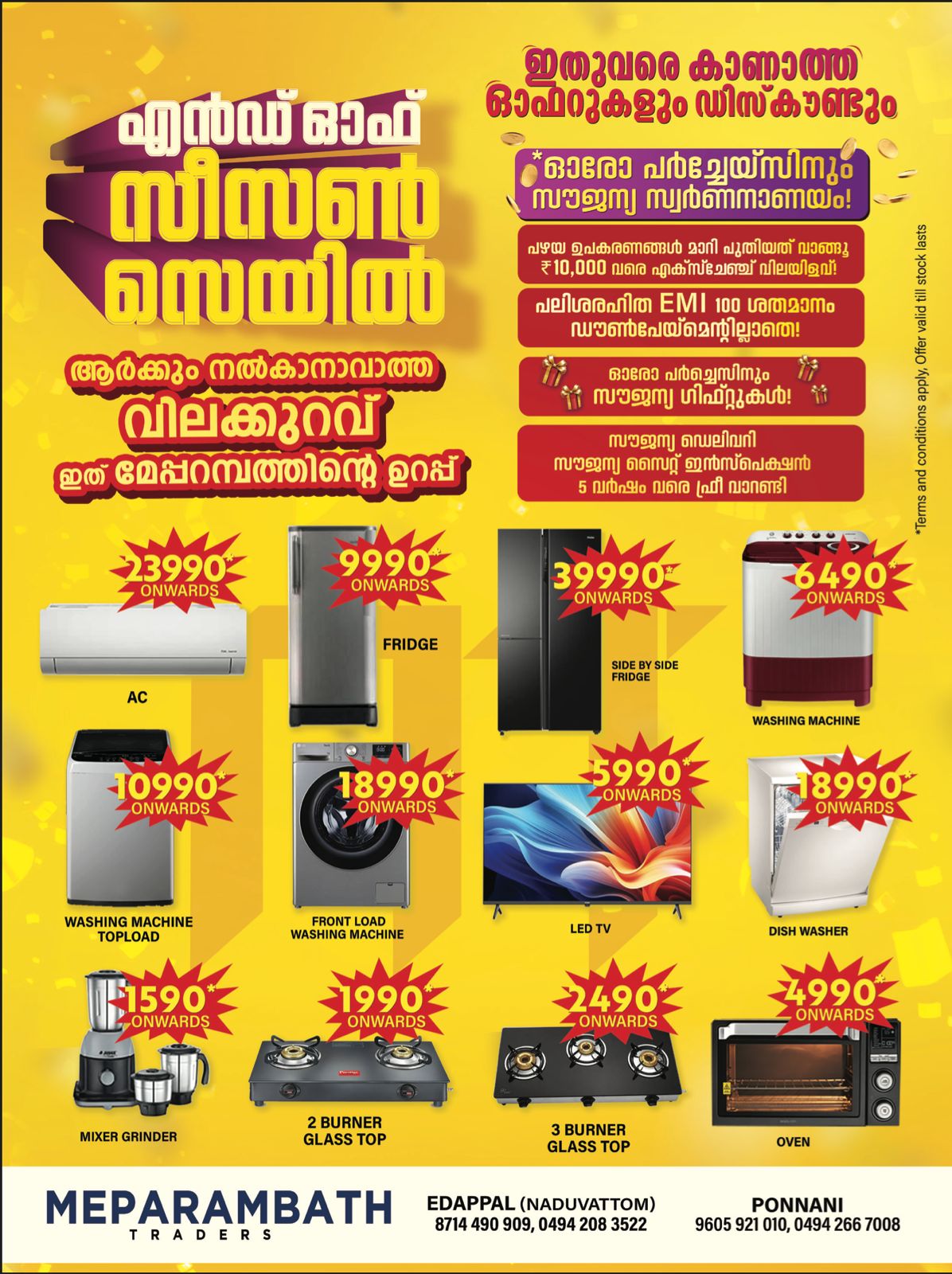 <p>*<strong>&#8220;à´à´°àµ പർà´àµà´àµà´¯àµà´¸à´¿à´¨àµà´ à´¸àµà´à´¨àµà´¯ à´¸àµà´µàµ¼à´£à´¨à´¾à´£à´¯à´!!!</strong><br>▪ï¸à´ªà´´à´¯ à´à´ªà´à´°à´£à´àµà´àµ¾ മാറി à´ªàµà´¤à´¿à´¯à´¤àµ വാà´àµà´àµ 10,000 വരൠà´à´àµà´¸àµà´àµà´àµà´àµ വിലയിളവàµ<br>▪ï¸à´ªà´²à´¿à´¶à´°à´¹à´¿à´¤ EMI 100 ശതമാനà´<br>à´¡àµàµºà´ªàµà´¯àµà´®àµà´¨àµà´±à´¿à´²àµà´²à´¾à´¤àµ<br>▪ï¸à´à´°àµ പർà´àµà´àµà´¸à´¿à´¨àµà´ à´¸àµà´à´¨àµà´¯ à´à´¿à´«àµà´±àµà´±àµà´àµ¾<br>à´¸àµà´à´¨àµà´¯ à´¡àµà´²à´¿à´µà´±à´¿<br>▪ï¸à´¸àµà´à´¨àµà´¯ à´¸àµà´±àµà´±àµ à´àµ»à´¸àµà´ªàµà´àµà´·àµ»<br>5 വർഷഠവരൠഫàµà´°àµ വാറണàµà´à´¿<br>ð¹AC 23990 ONWARDS<br>ð¹FRIDGE 9990 ONWARDS<br>ð¹SIDE BY SIDE FRIDGE 39990 ONWARDS<br>ð¹WASHING MACHINE 6490 ONWARDS<br>ð¹WASHING MACHINE TOPLOAD 10990<br>ONWARDS<br>ð¹FRONTLOAD WASHING MACHINE 18990<br>ONWARDS<br>ð¹LED TV 5990 ONWARDS<br>ð¹DISH WASHER 18990 ONWARDS<br>ð¹MIXER GRINDER 1590 ONWARDS<br>ð¹2 BURNER GLASS TOP 1990 ONWARDS<br>ð¹3 BURNER GLASS TOP 2490 ONWARDS<br>ð¹OVEN 4990 ONWARDS</p>