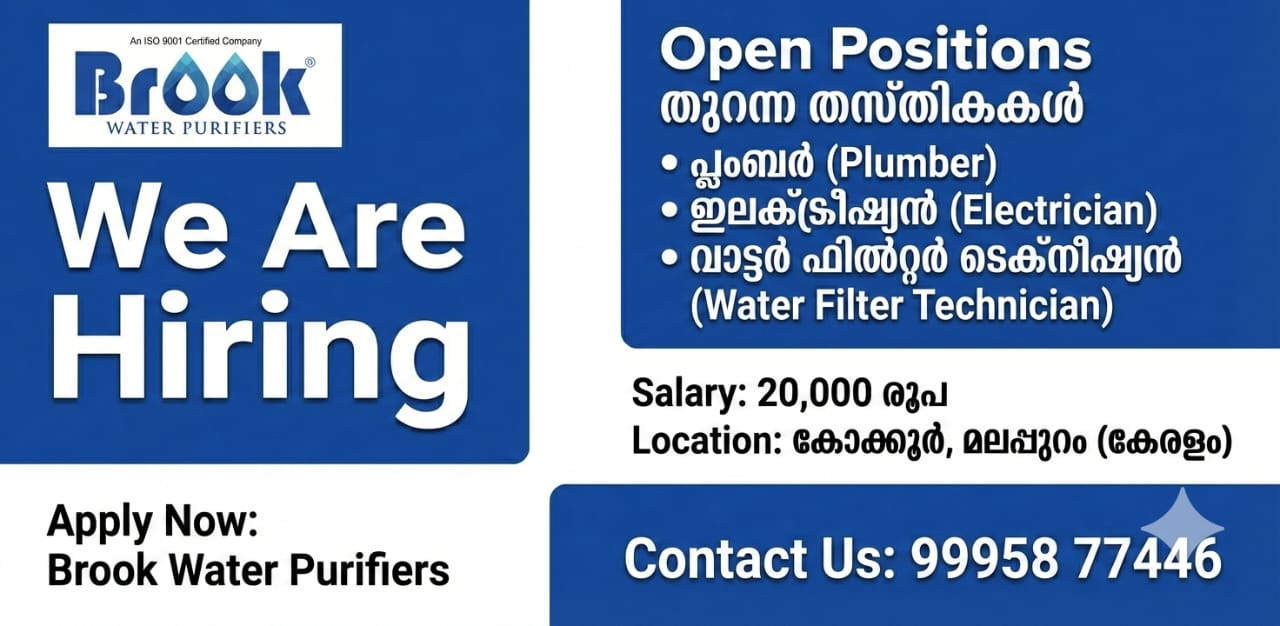 <h2 class="wp-block-heading">Apply Now:<br>Brook Water Purifiers<br>Open Positions<br>à´¤àµà´±à´¨àµà´¨ തസàµà´¤à´¿à´à´àµ¾<br>à´ªàµà´²à´à´¬àµ¼ (Plumber)</h2>